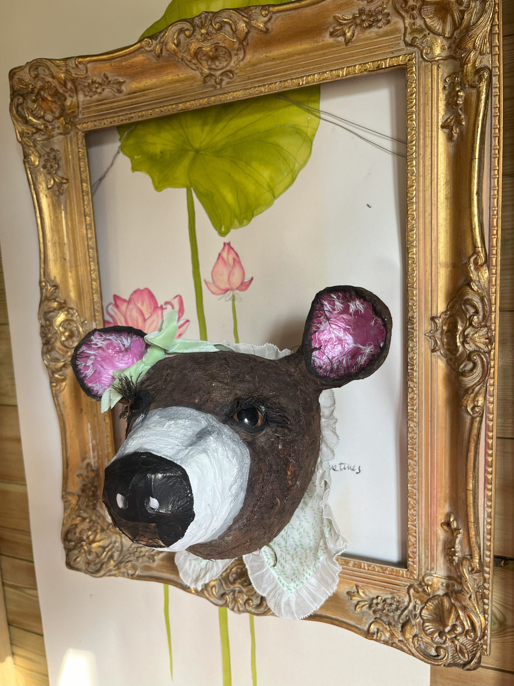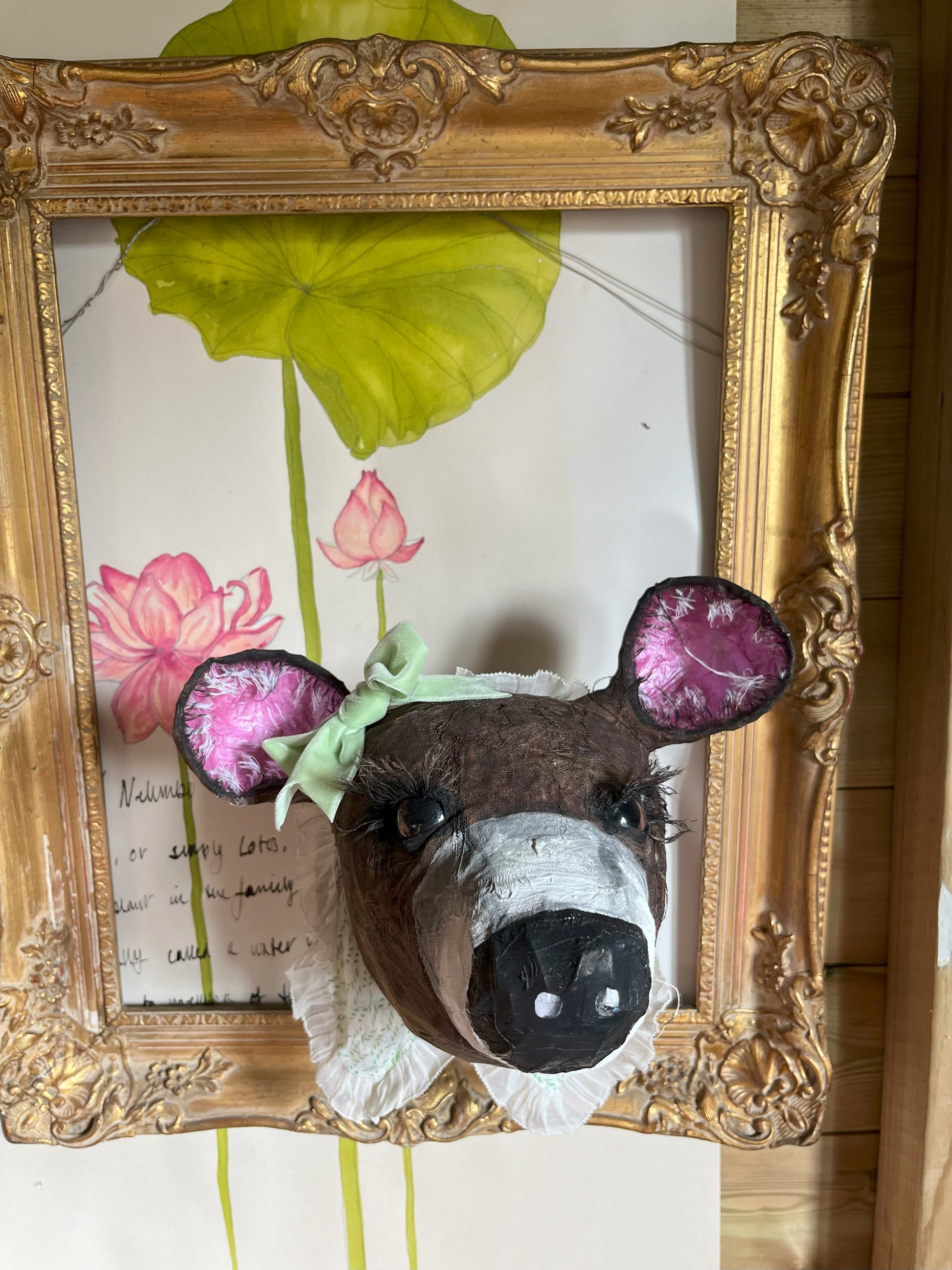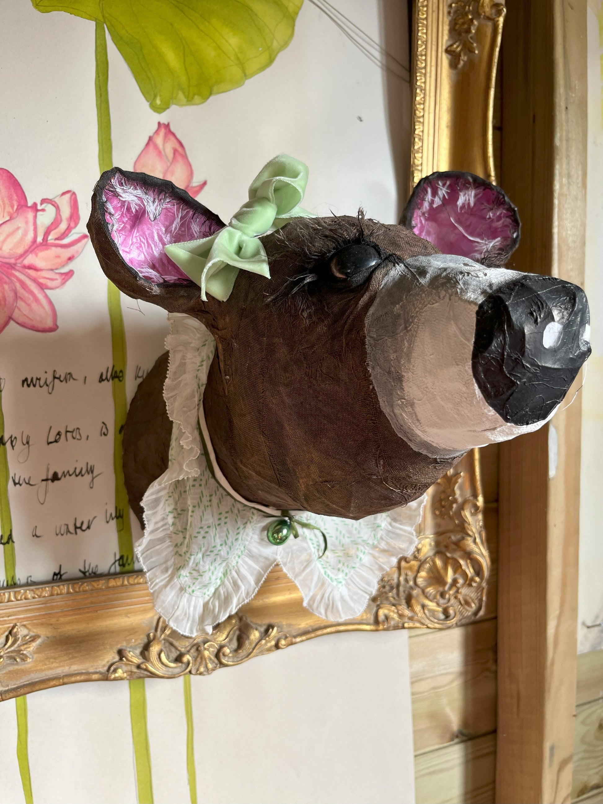 A gentle young cub dressed in a delicate vintage collar and a bow for a midnight wander through the forest!