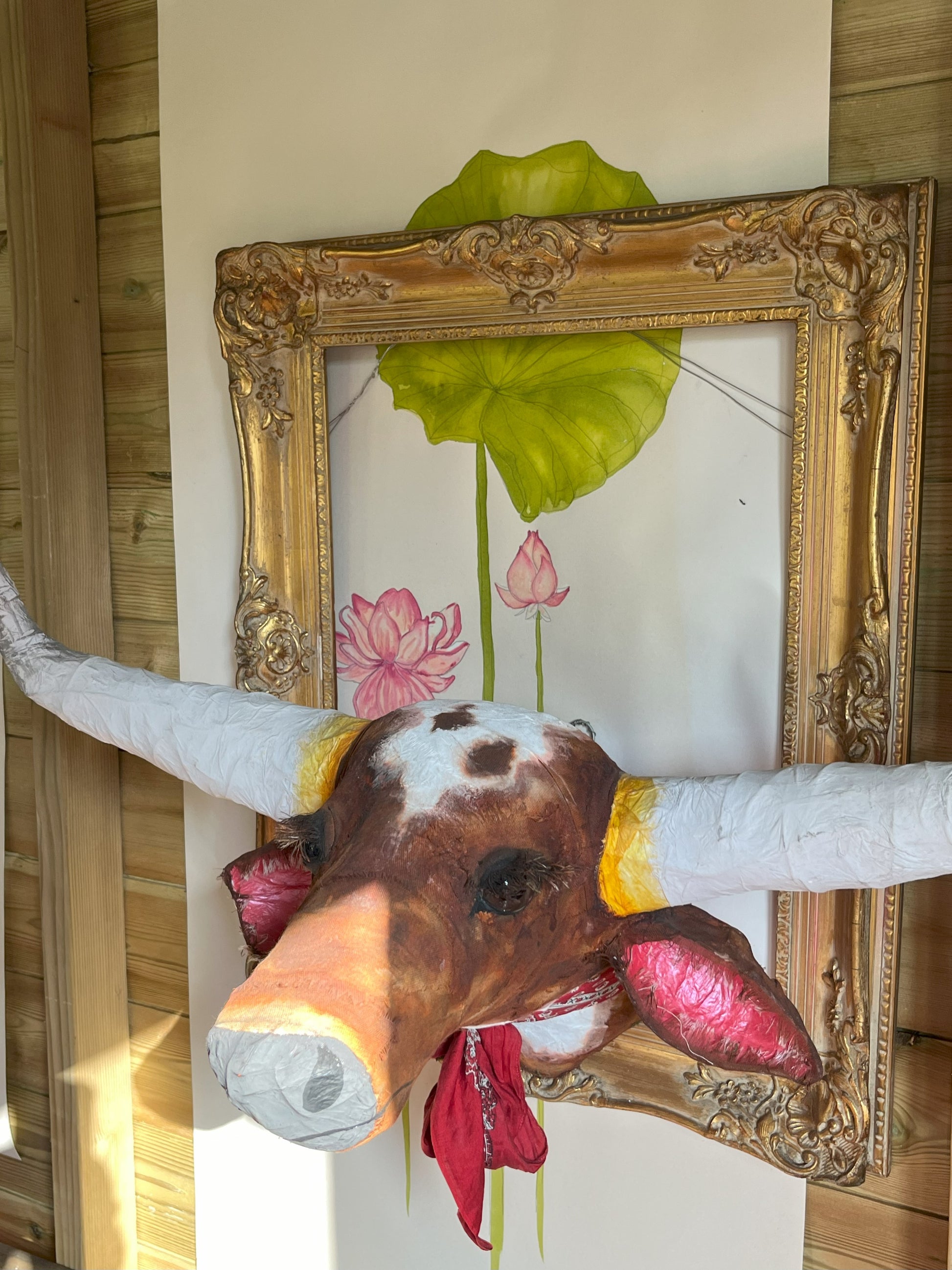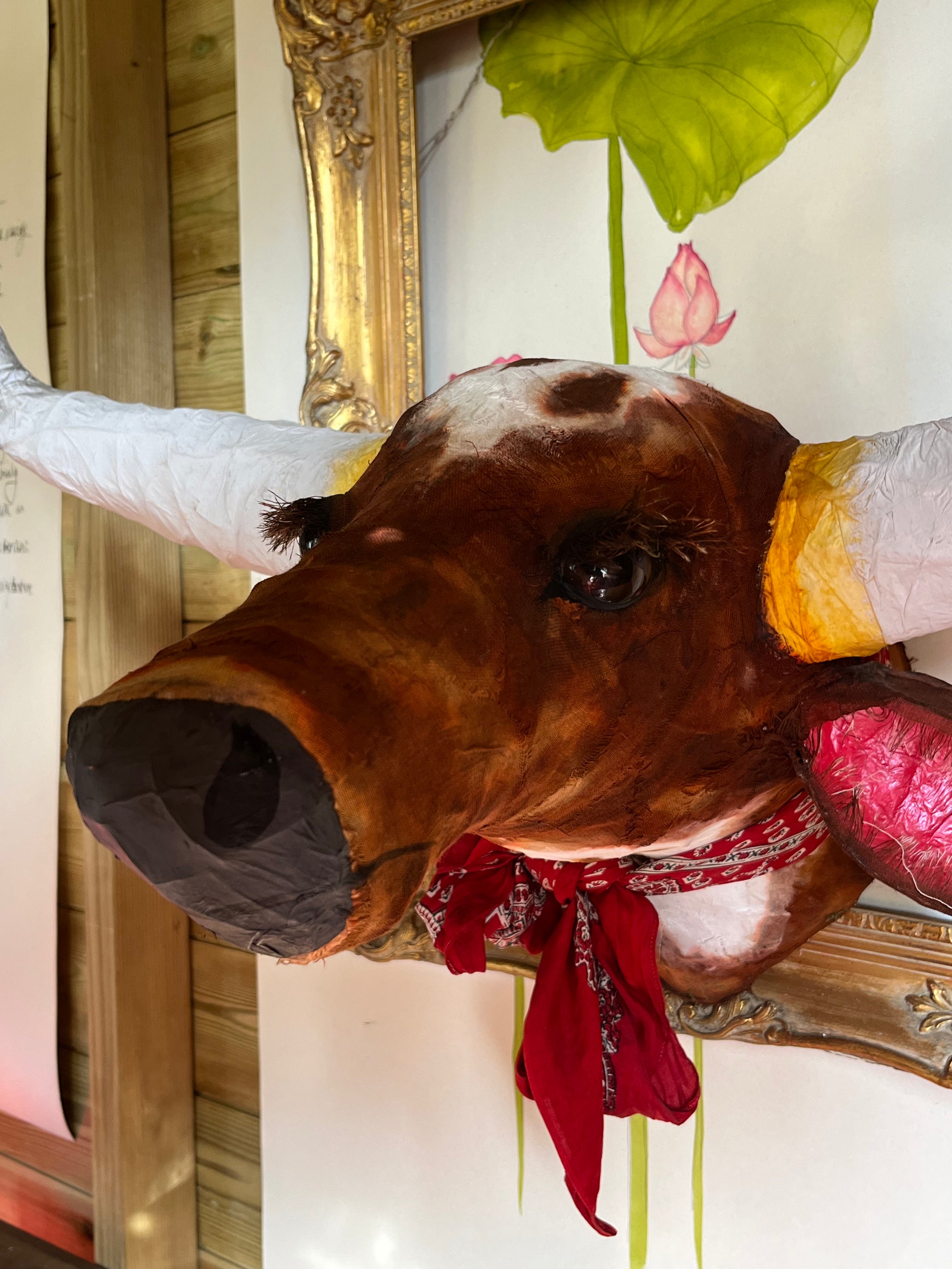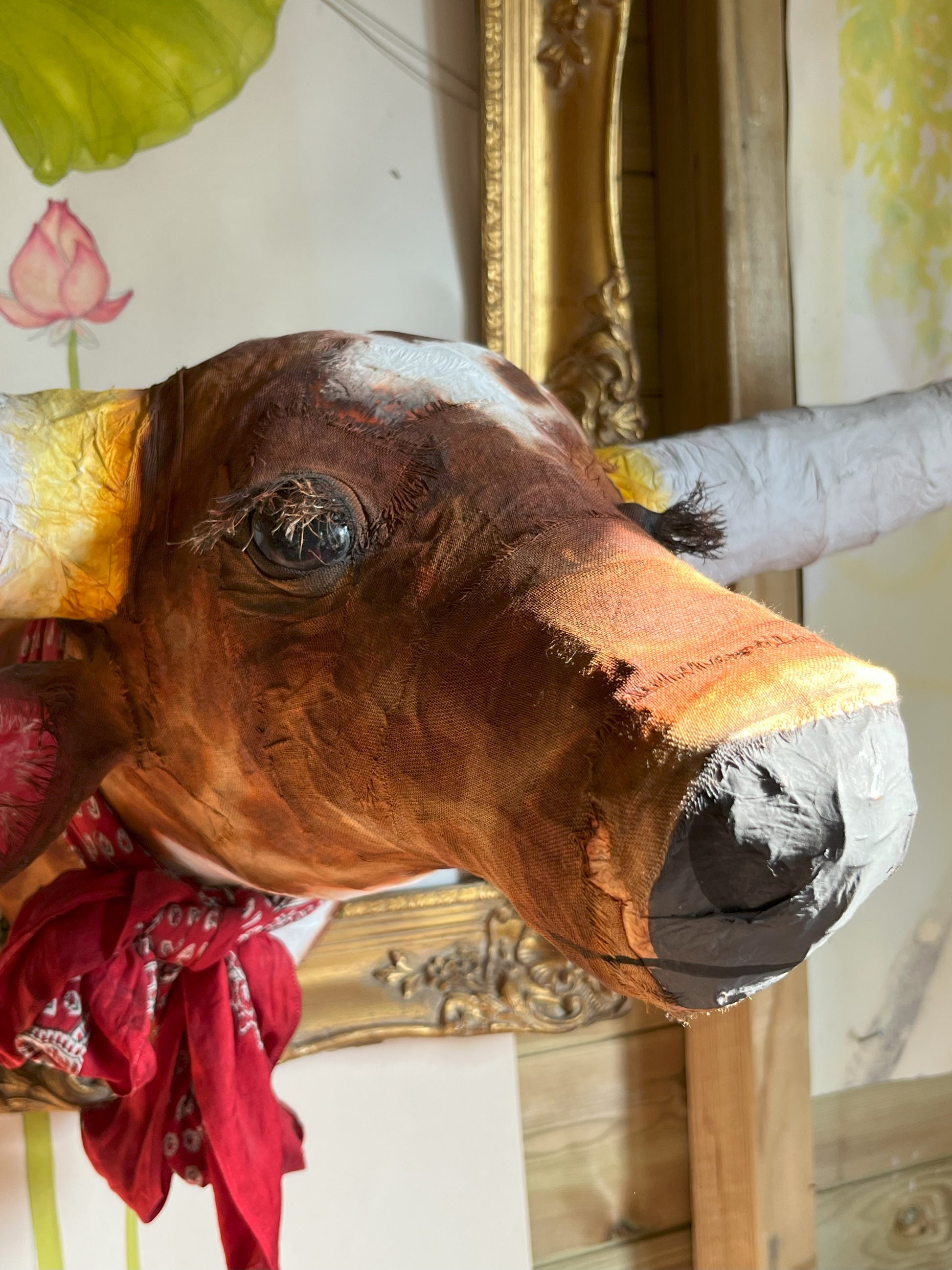 Quite a large proud bovine with lovely big brown eyes which are framed with big long eyelashes! Carrying very impressive long horns and dressed in a red neckerchief!