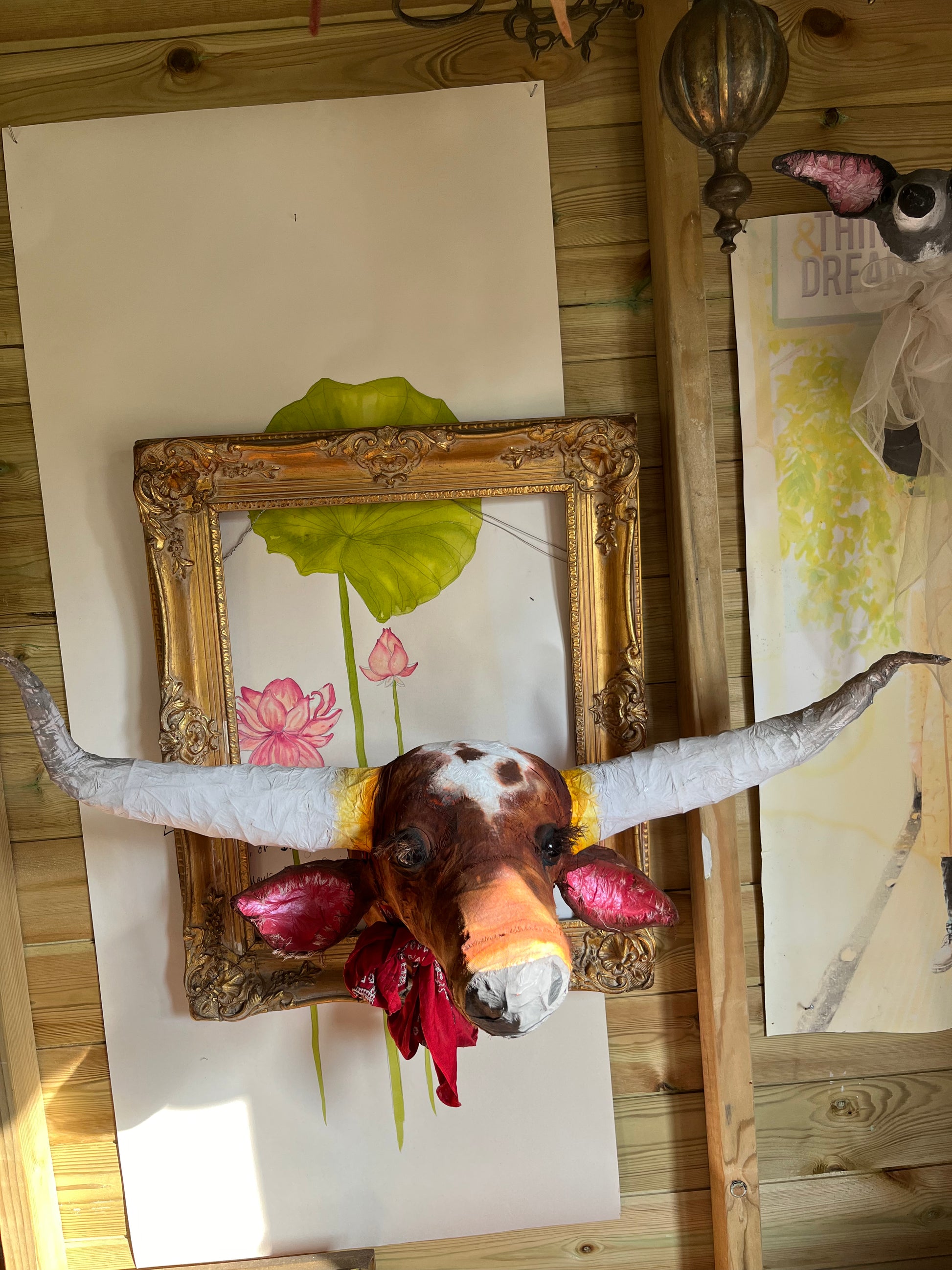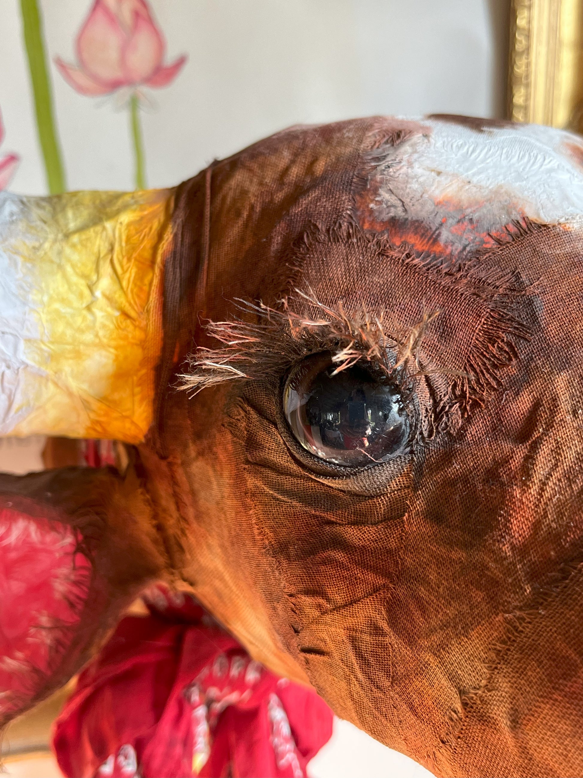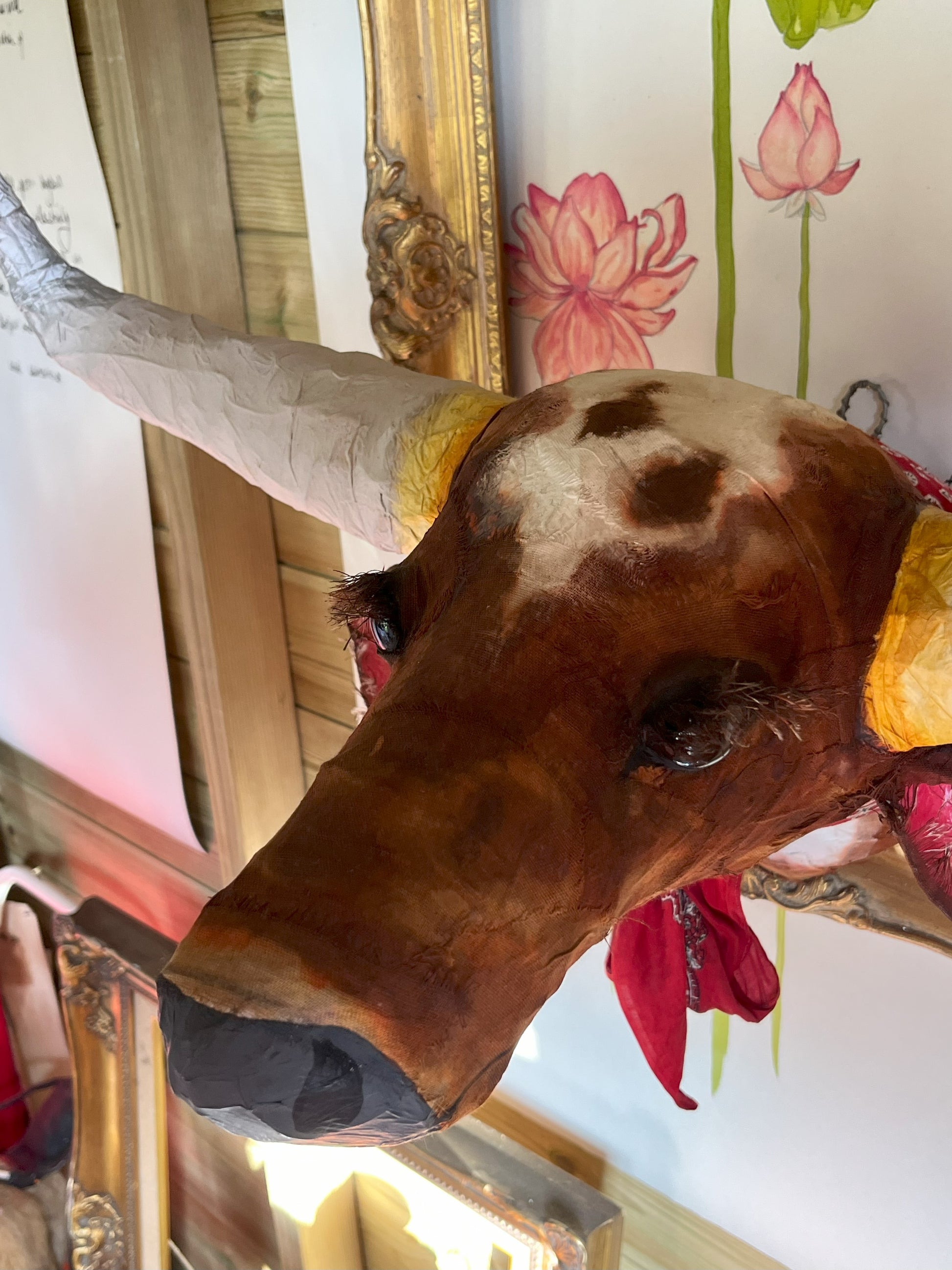 Quite a large proud bovine with lovely big brown eyes which are framed with big long eyelashes! Carrying very impressive long horns and dressed in a red neckerchief!